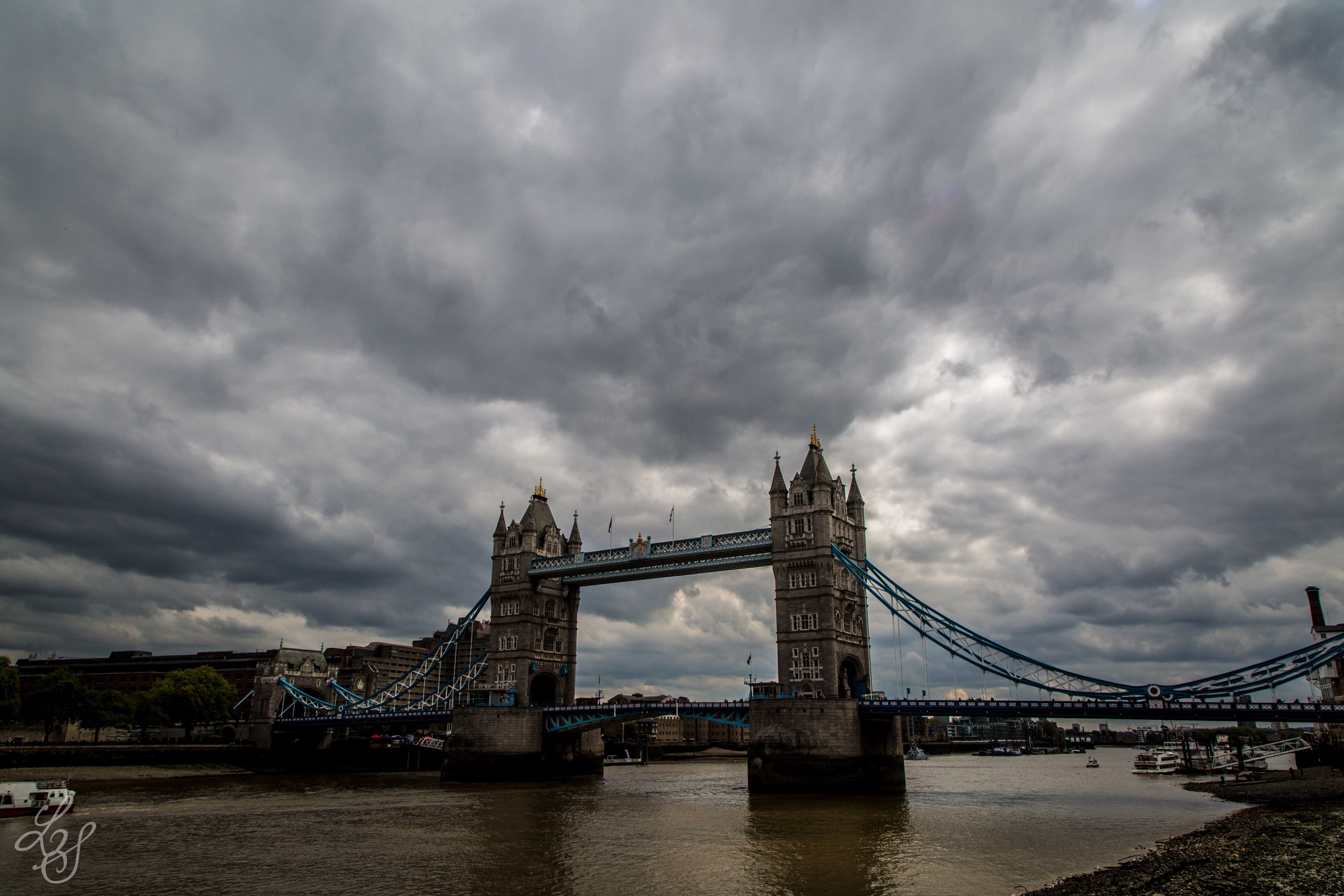 A dramatic view of London Bridge – usual London clouds are hovering on this typical sight.
